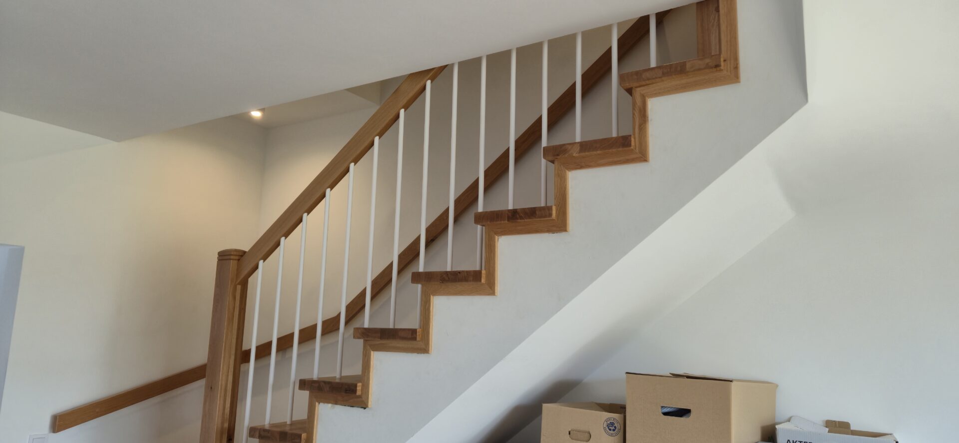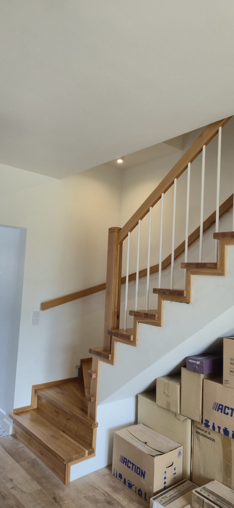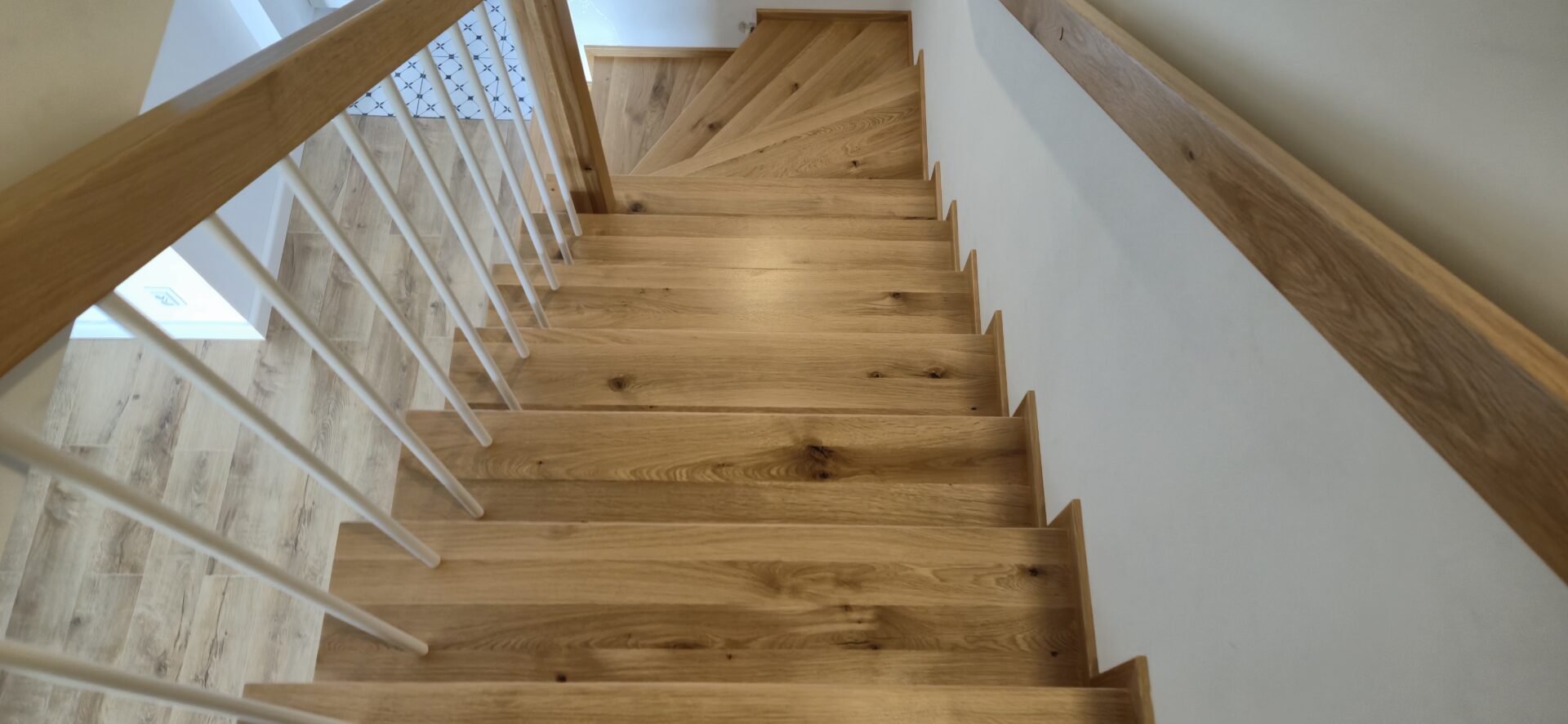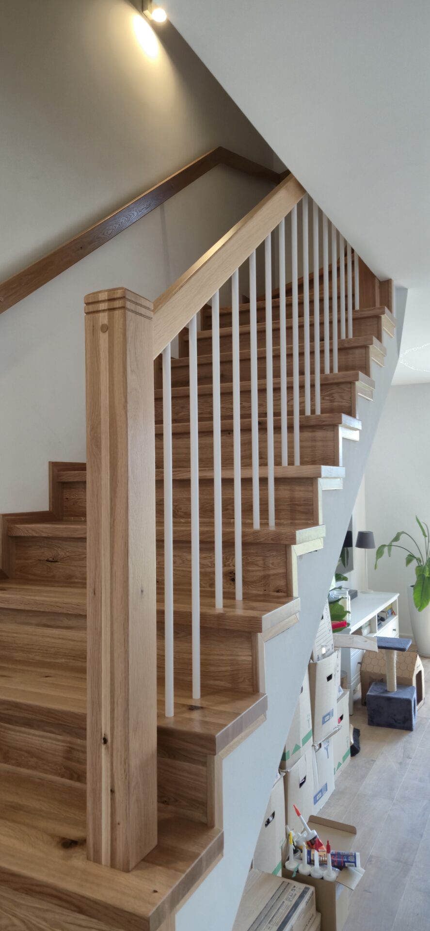 Schody dębowe klasa natur , sęki szpachlowane na czarno , balustrada rurka stalowa biała