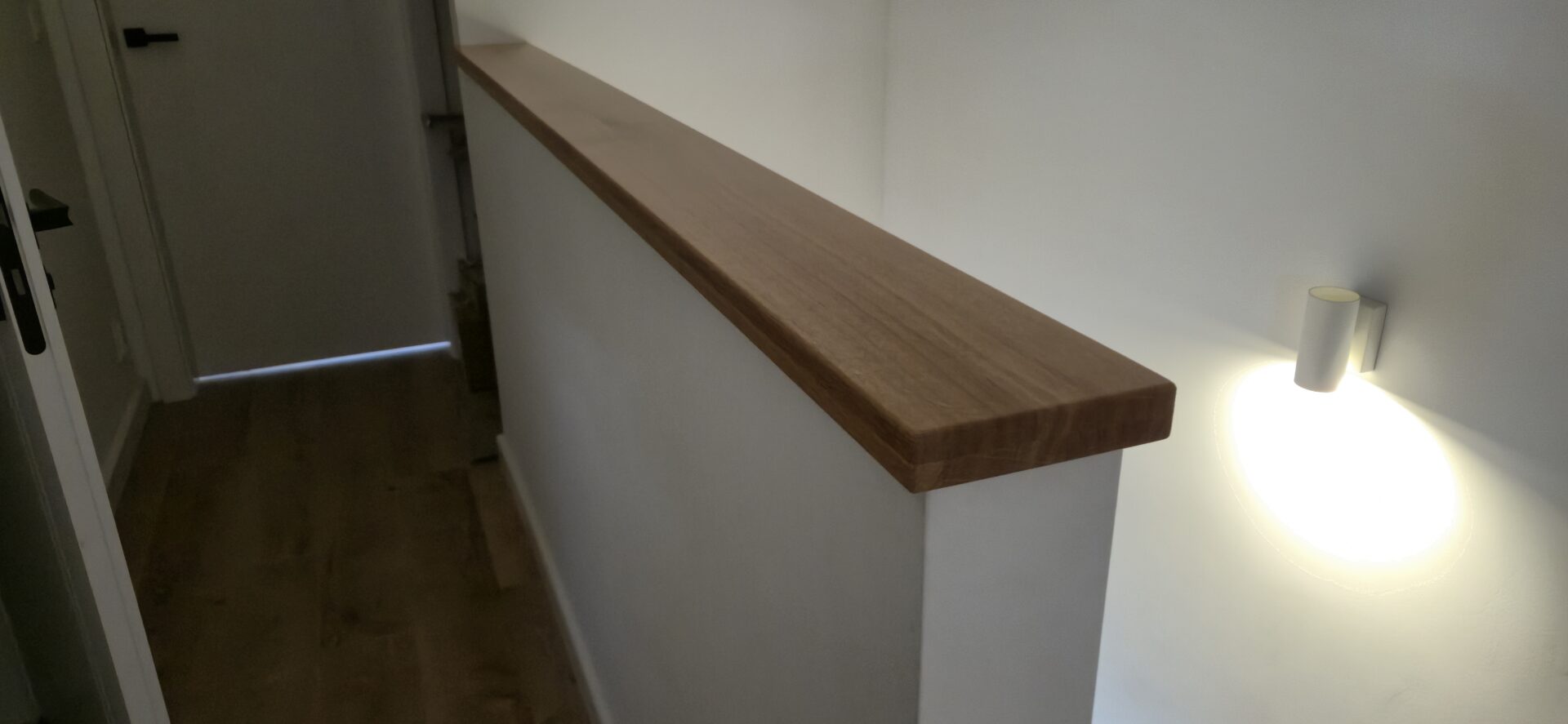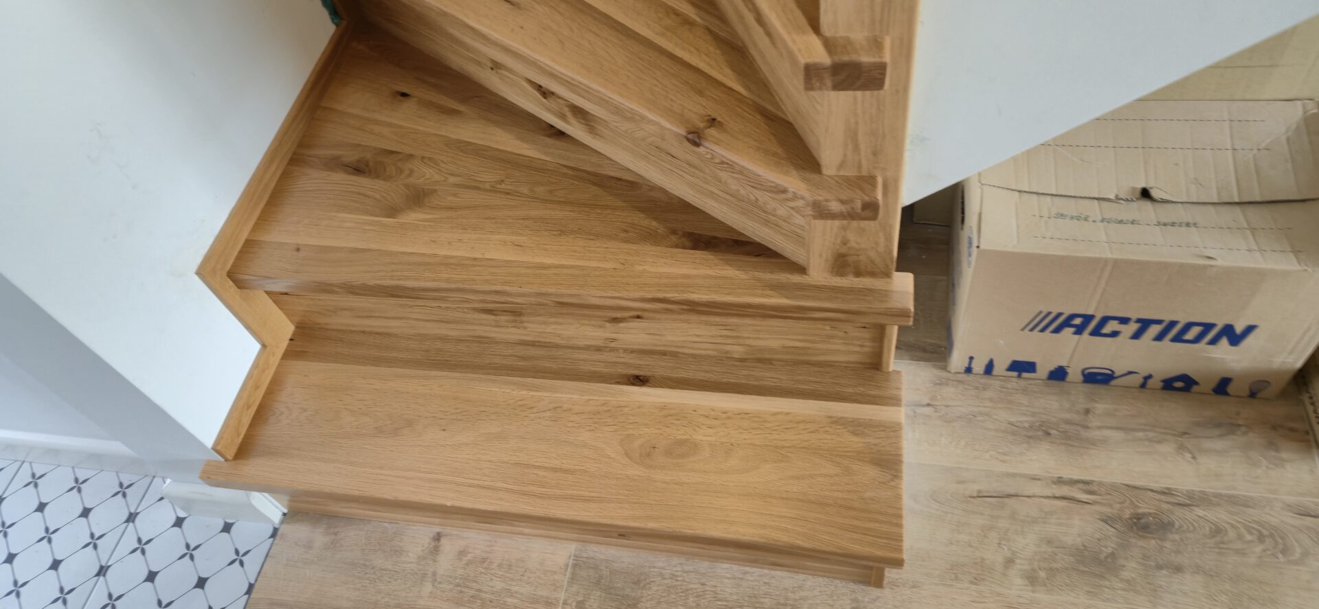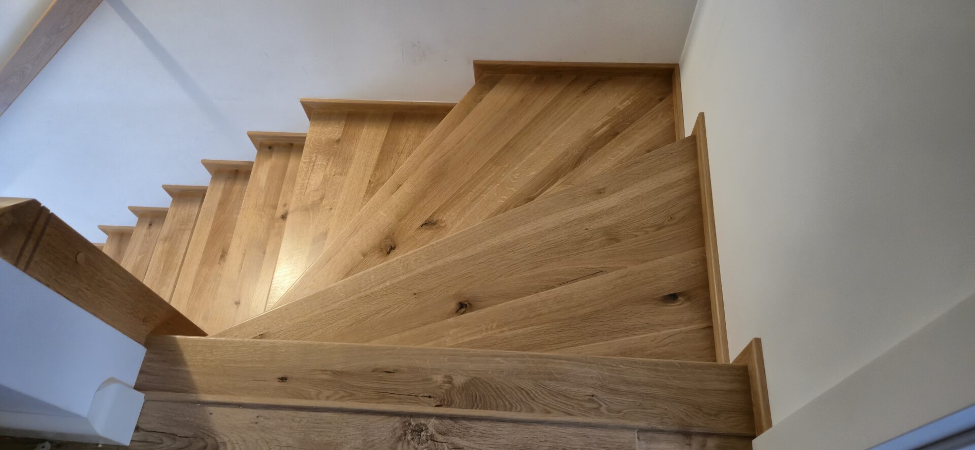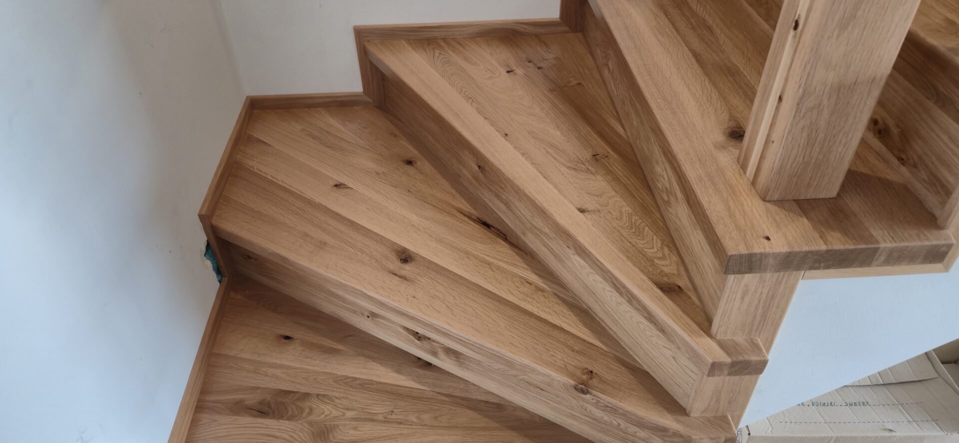 Schody dębowe klasa natur , sęki szpachlowane na czarno , balustrada rurka stalowa biała