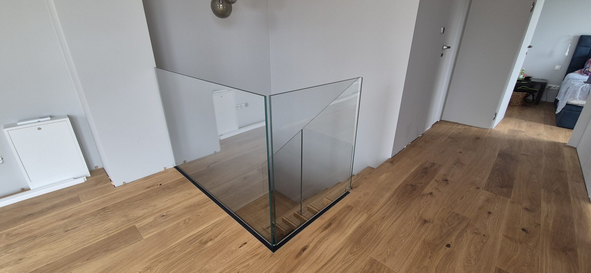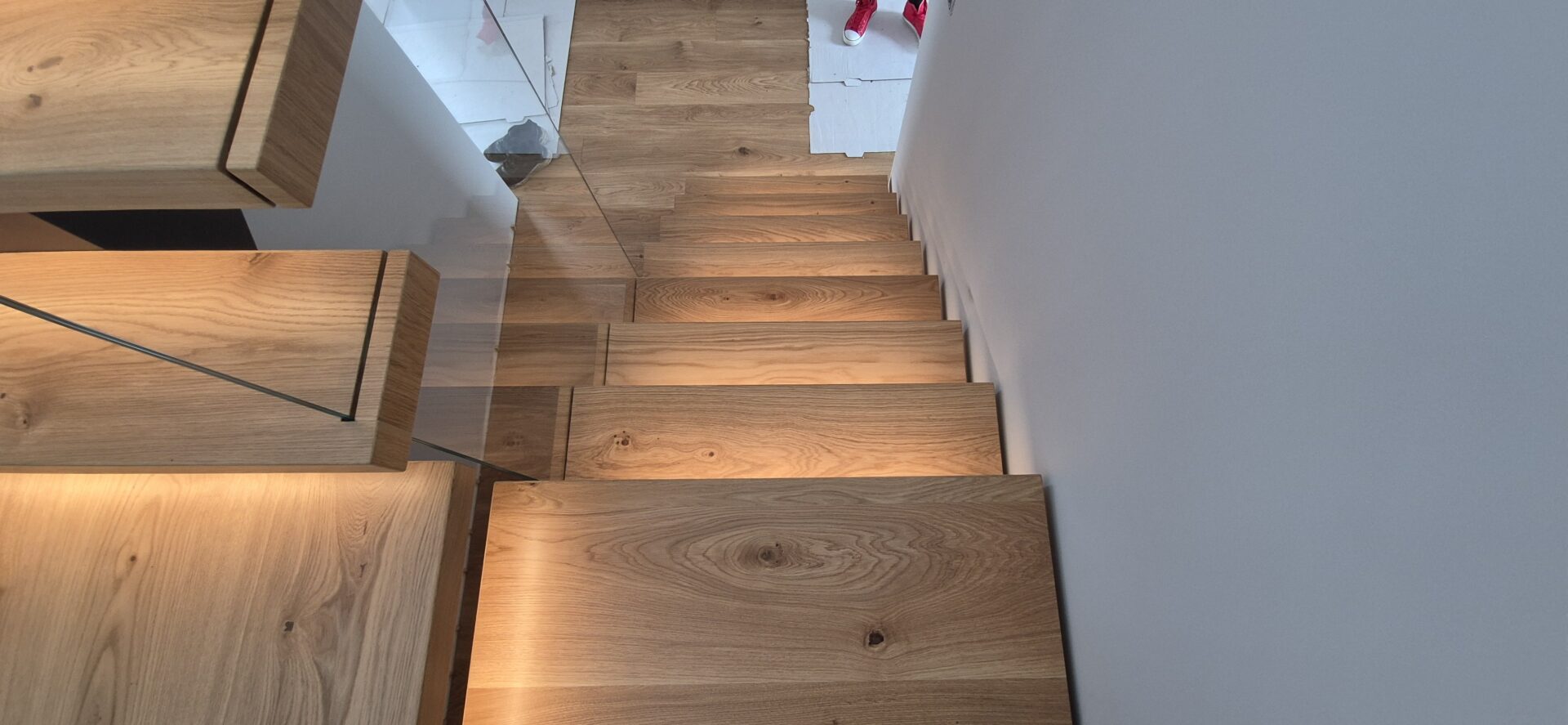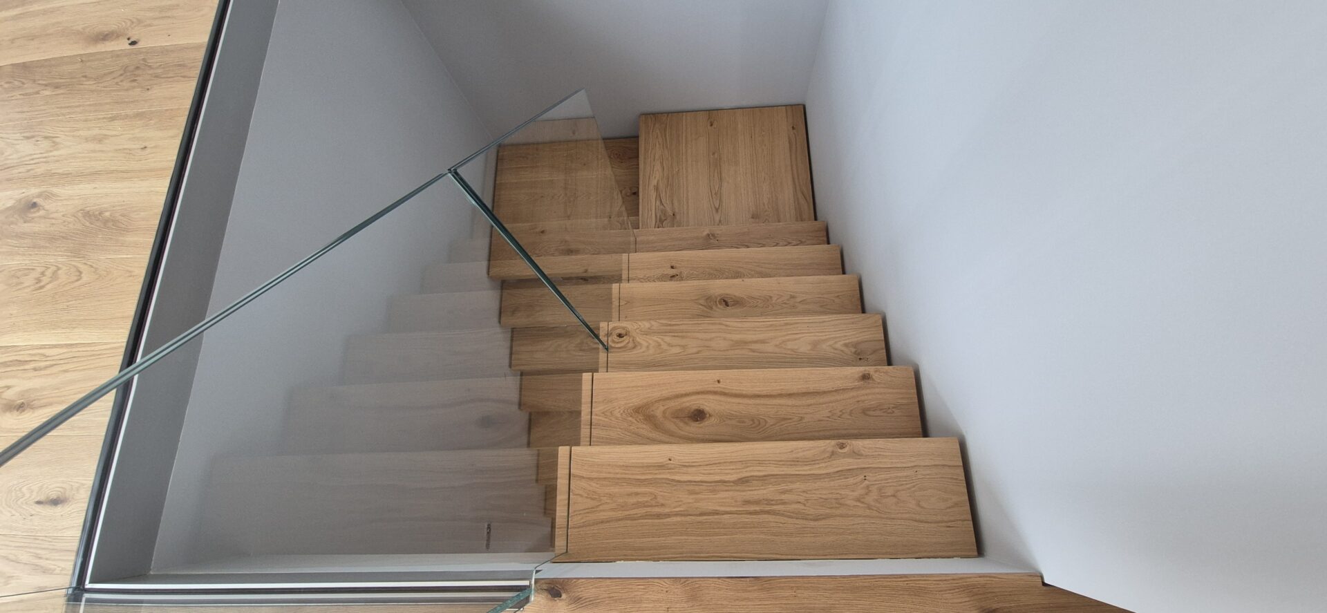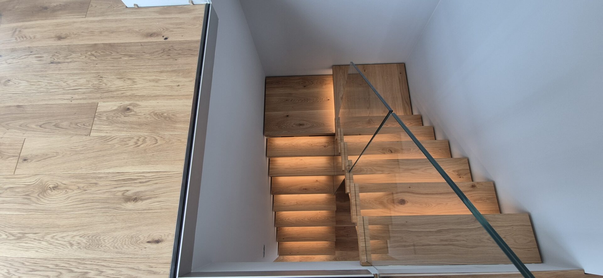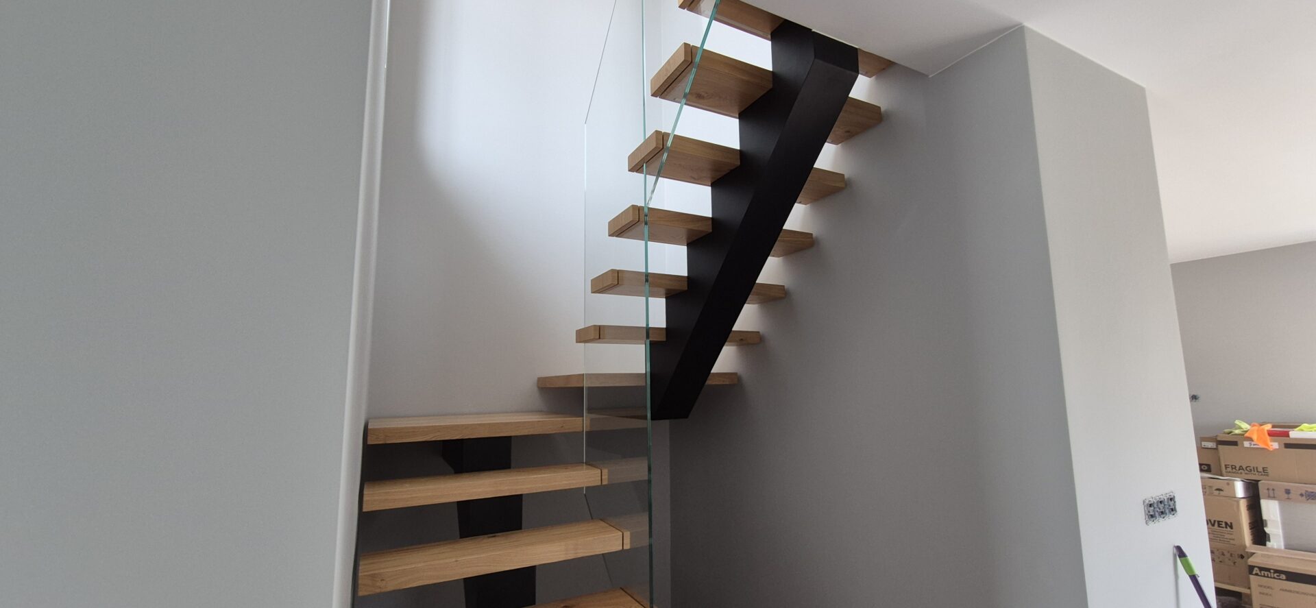 Schody na belce centralnej stalowej , stopnie dębowe obłogowane klasa rustic , szyba optwhite ukryty montaż